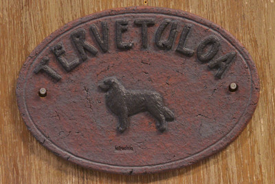 Tervetuloa yms. kyltit. Keramiikkaa, patinoitu. Kyltin koko korkeus 16 cm, leveys 23 cm. Kyltti kiinnitettäväksi seinälle, esim. ovenpieleen.