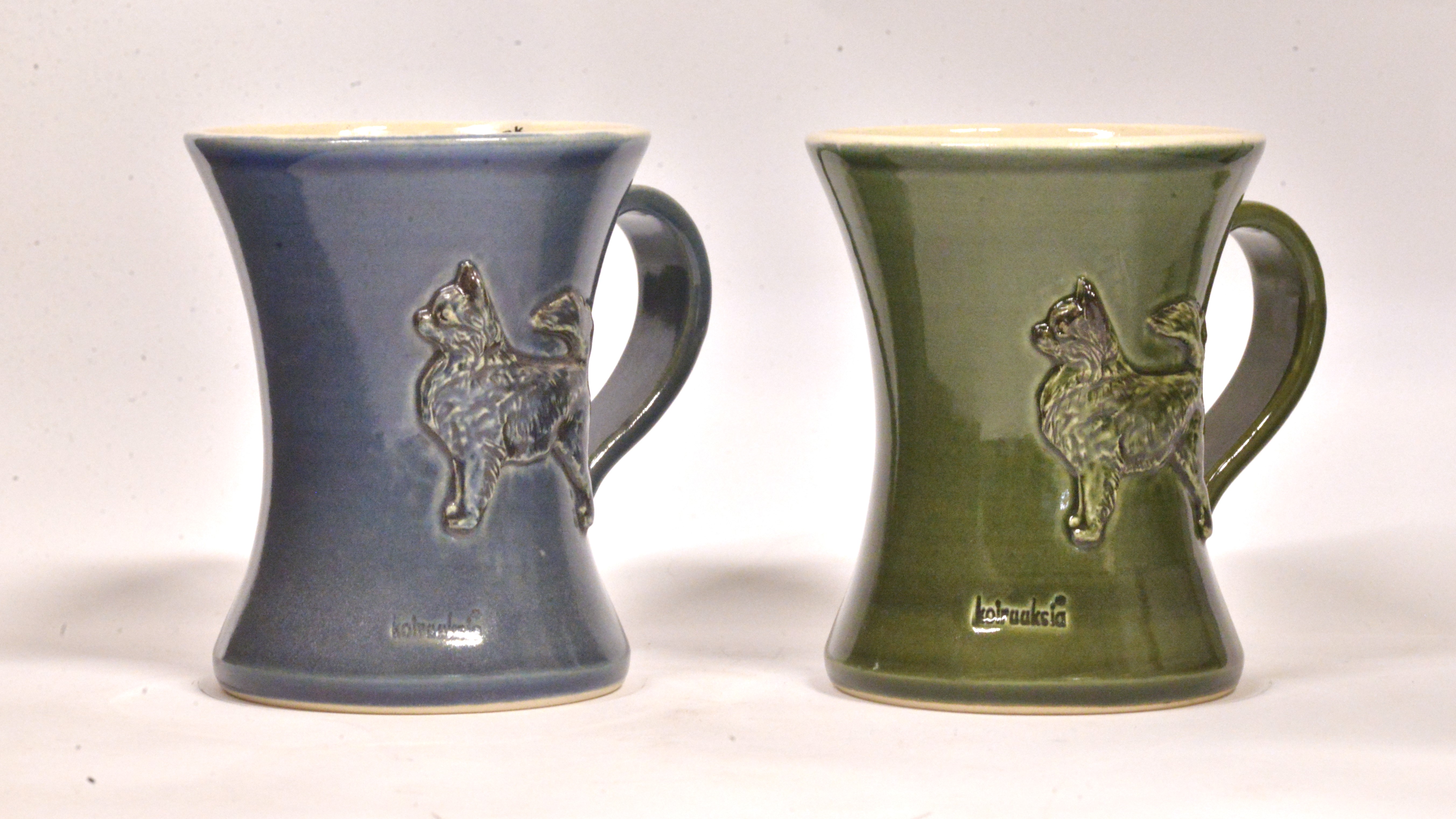 Mukien valmistus vie noin kaksi viikkoa. Mukit kestävät astianpesukoneen ja mikron. Mukin koko: korkeus noin 10 cm ja yläreunan halkaisija noin 9 cm.