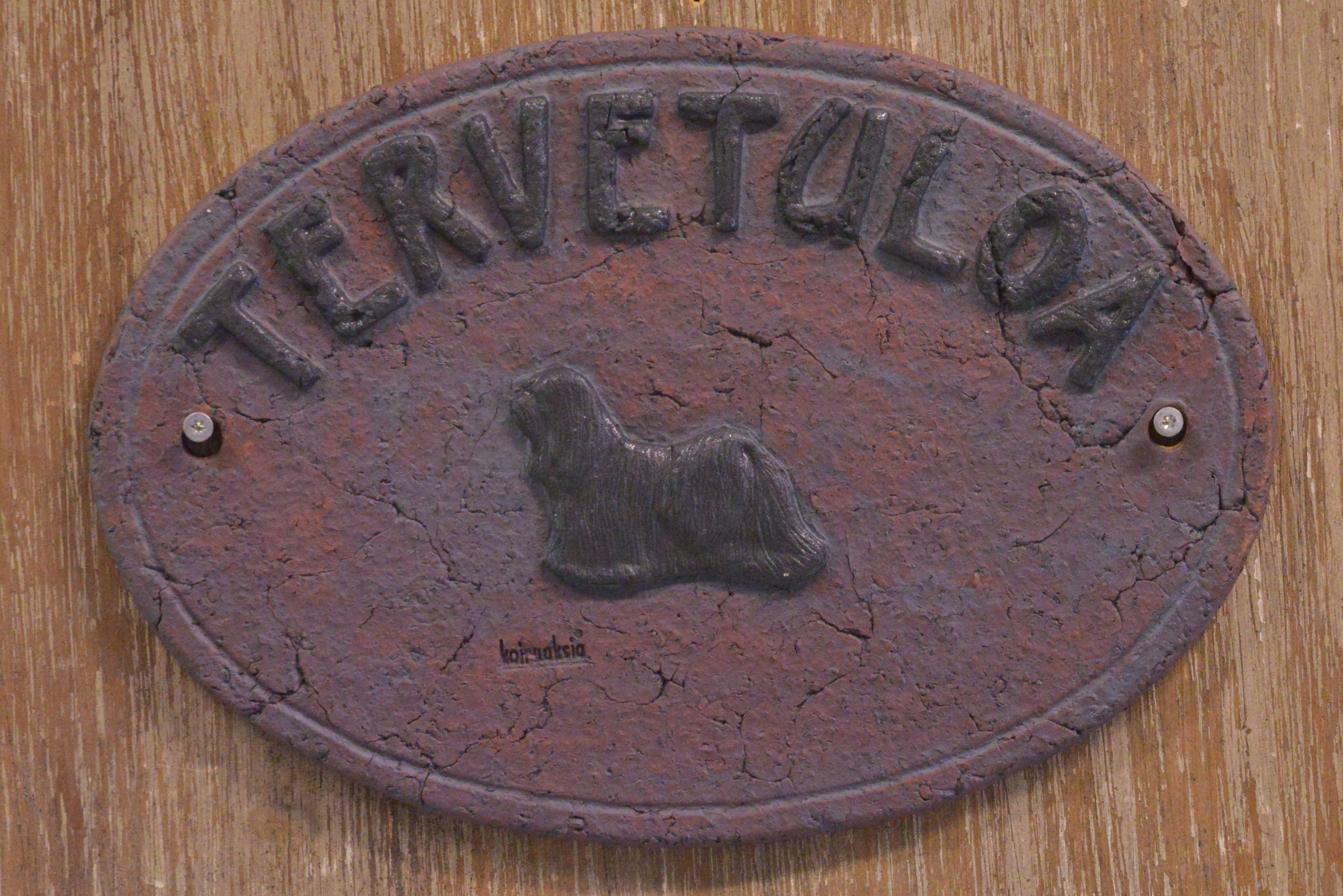 Tervetuloa yms. kyltit. Keramiikkaa, patinoitu. Kyltin koko korkeus 16 cm, leveys 23 cm. Kyltti kiinnitettäväksi seinälle, esim. ovenpieleen.
