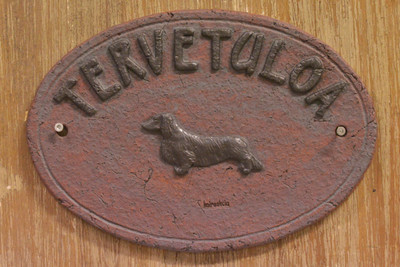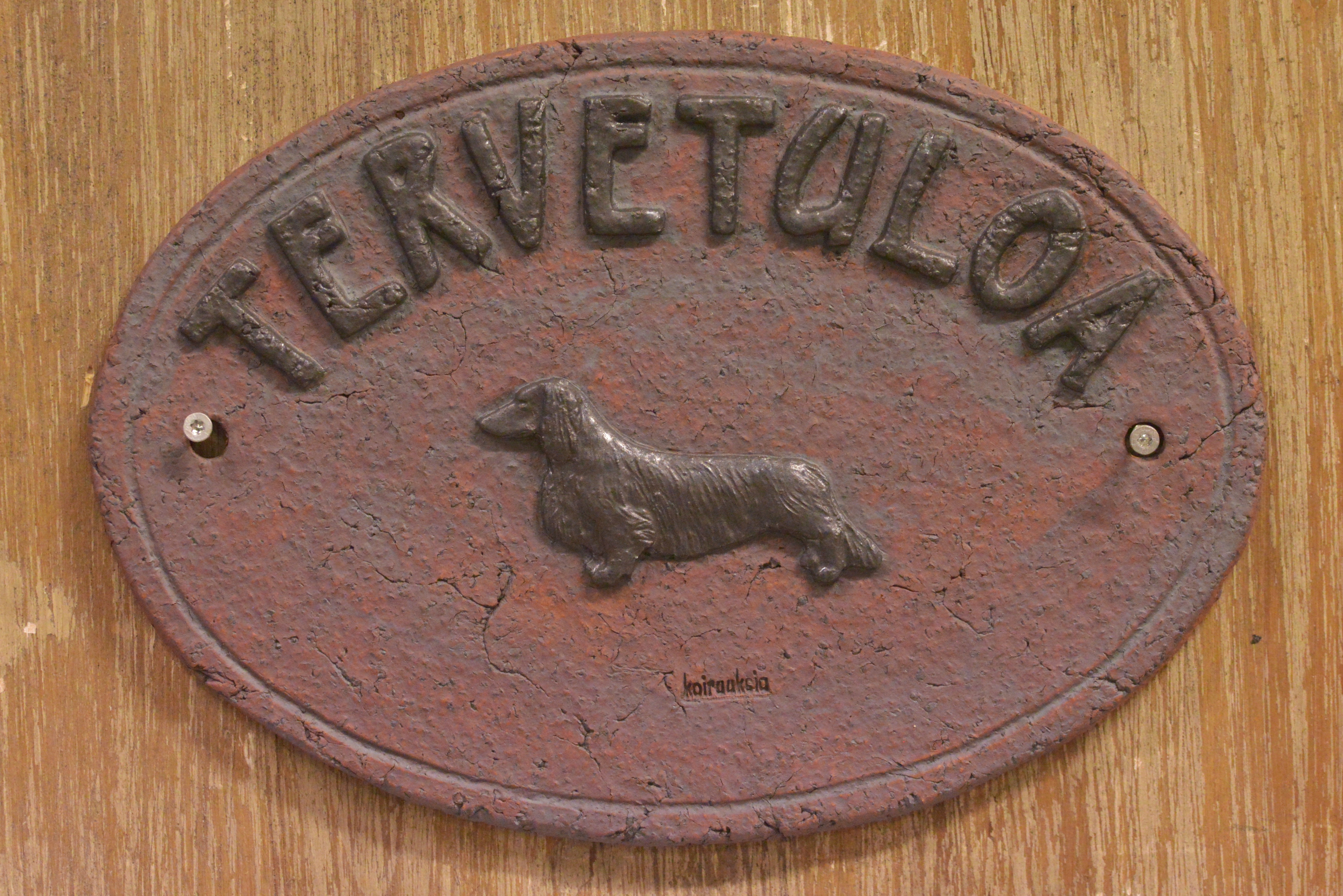 Tervetuloa yms. kyltit. Keramiikkaa, patinoitu. Kyltin koko korkeus 16 cm, leveys 23 cm. Kyltti kiinnitettäväksi seinälle, esim. ovenpieleen.