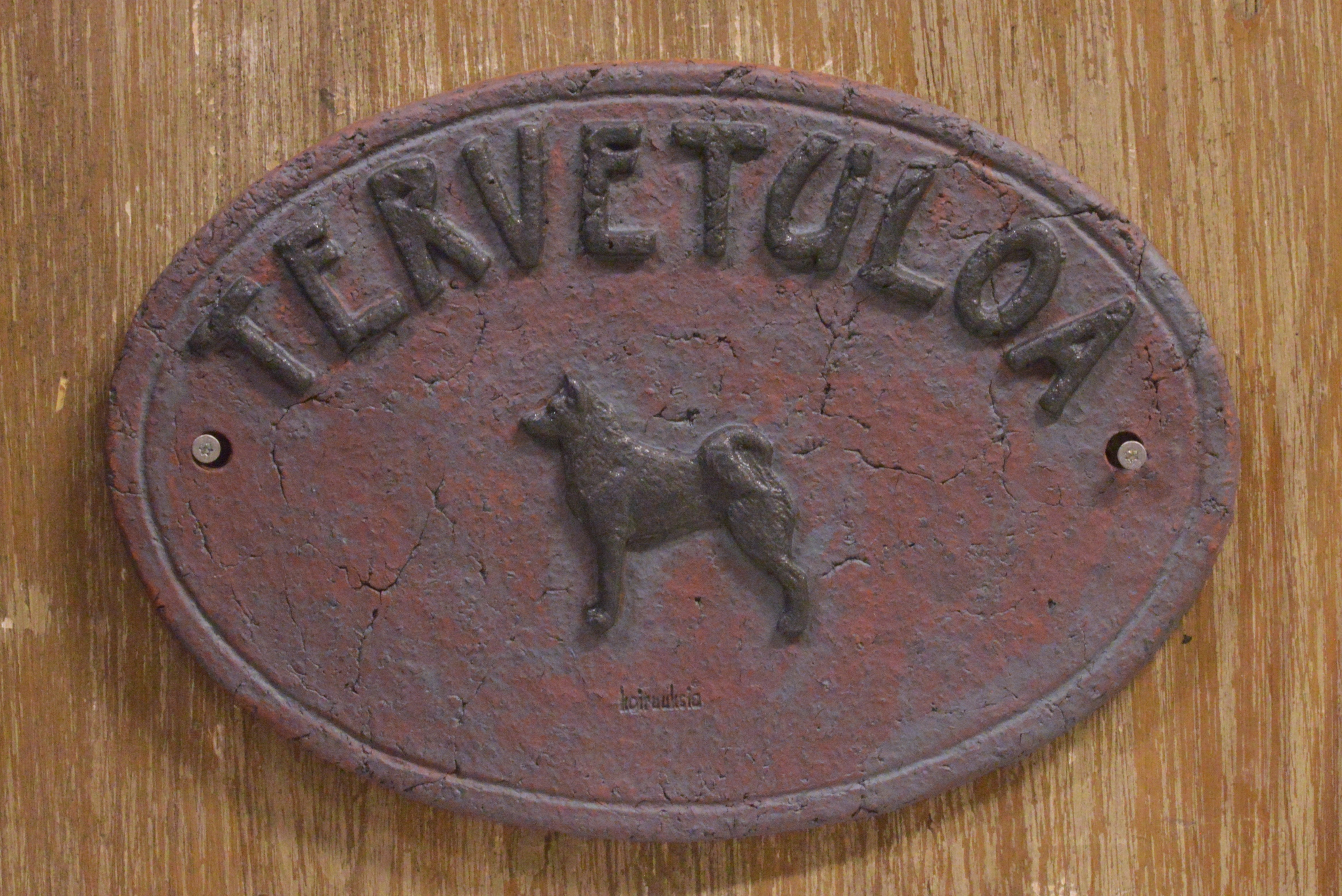 Tervetuloa yms. kyltit. Keramiikkaa, patinoitu. Kyltin koko korkeus 16 cm, leveys 23 cm. Kyltti kiinnitettäväksi seinälle, esim. ovenpieleen.